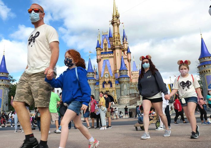 A masked family walks past Cinderella Castle in the Magic Kingdom, at Walt Disney World in Lake Buena Vista, Fla. Orlando Sentinel | Tribune News Service...