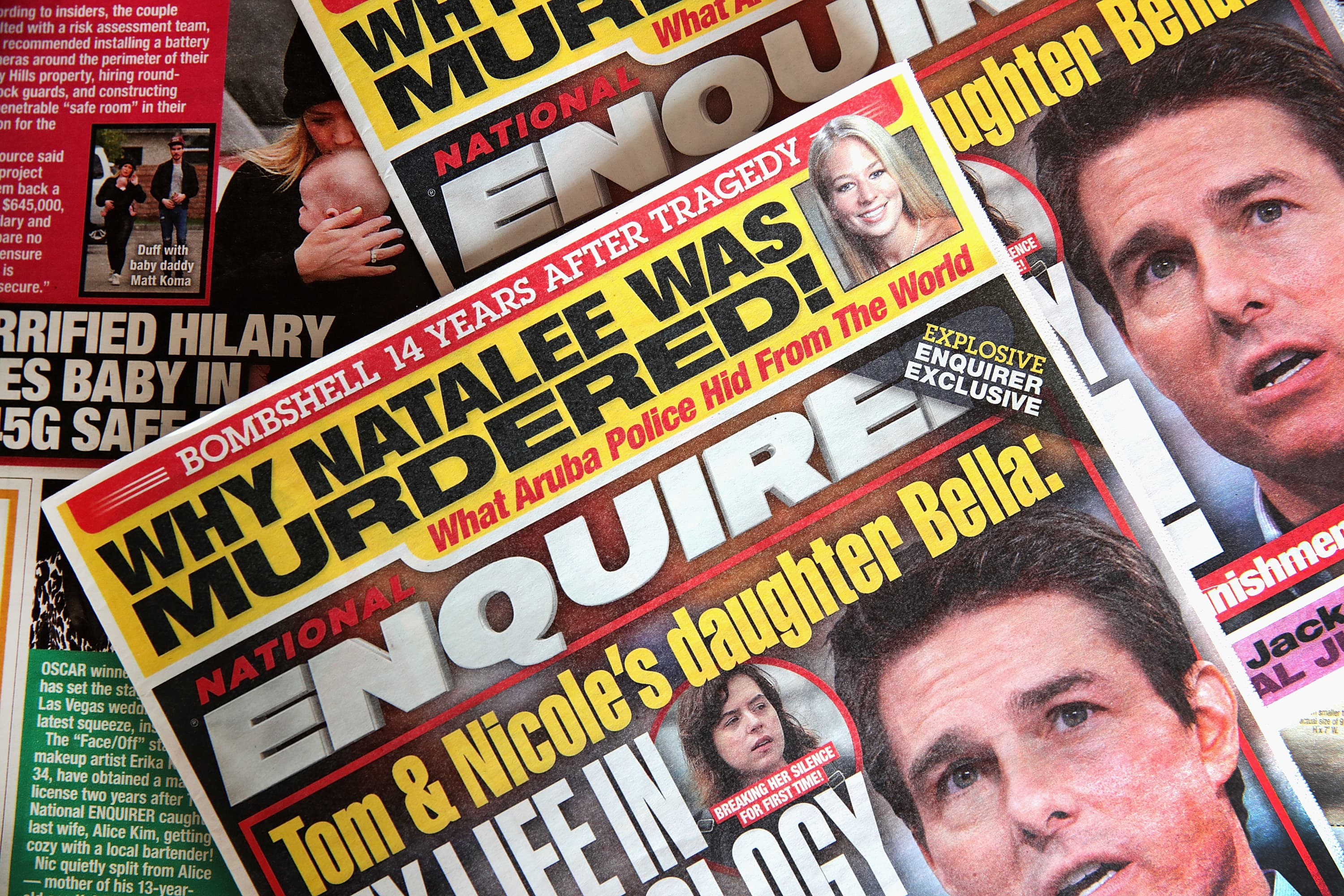 In this photo illustration, celebrity gossip dominates the cover of a National Enquirer magazine on April 11, 2019 in Chicago, Illinois.
